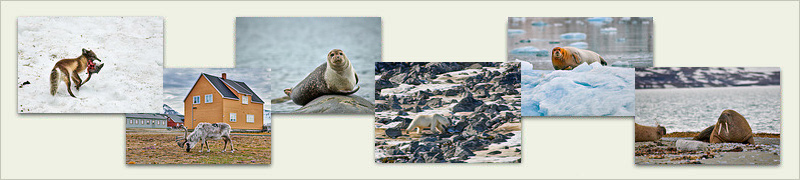 Polarfuchs, Rentier, Seehund, Eisbär, Bartrobbe und Walross.