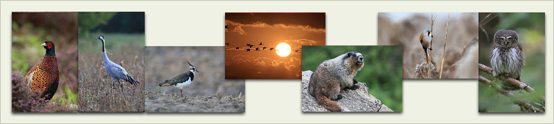 Fasan, Grauer Kranich, Kiebitz, Murmeltier, Bartmeise und Sperlingskauz.