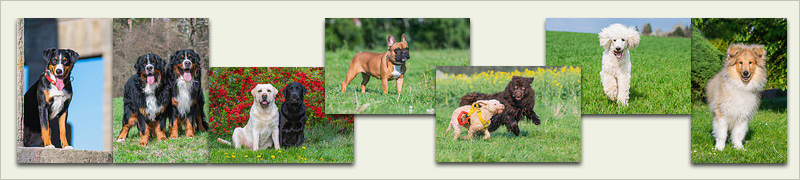 Appenzeller Sennenhund, Berner Sennenhund, Labrador Retriever, Französische Bulldogge, Lagotto Romagnolo, Neufundländer, Großpudel und Collie.