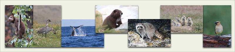 Amerikanischer Schwarzbär, Buckelwal, Waschbär, Schwarzschwanz-Präriehund und Zedernseidenschwanz.