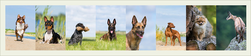 Darunter finden Sie: Australian Shepherd, Basenji, Deutsch Drahthaar, Holländischer Schäferhund, Mischling, Rhodesian Ridgeback, Zwergspitz und Gämse.