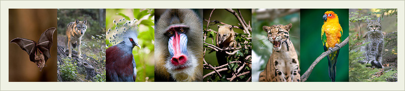 Brillenblattnase, Eurasischer Grauwolf, Fächertaube, Mandrill, Nasenbär, Nebelparder, Sonnensittich und Wildkatze.