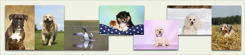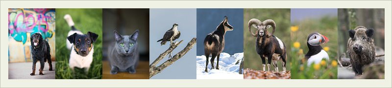 Gordon Setter, Jack Russell Terrier, Russisch Blau, Fischadler, Gämse, Mufflon, Papageitaucher, Wildschwein und andere.