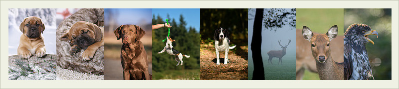 Bordeauxdogge, Chesapeake Bay Retriever, Jack Russell Terrier, Mischling, Rothirsch, Sikahirsch und Weißkopfseeadler.