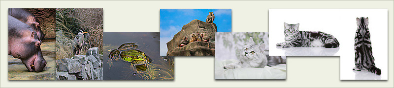 Flusspferd, Graureiher, Teichfrosch, Mantelpavian, Highlander und Britisch Kurzhaar.
