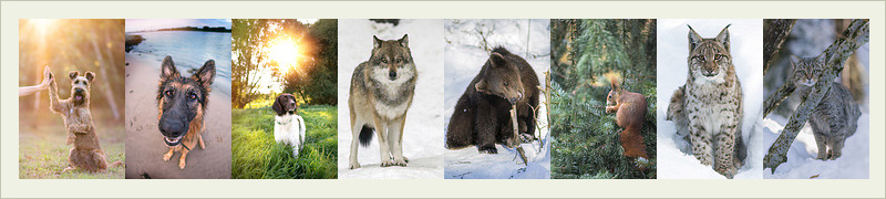 Irish Terrier, Deutscher Schäferhund, Kleiner Münsterländer, Eurasischer Grauwolf, Europäischer Braunbär, Europäisches Eichhörnchen, Karpatenluchs und Wildkatze.